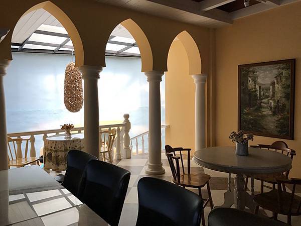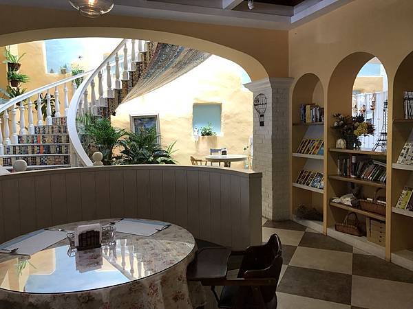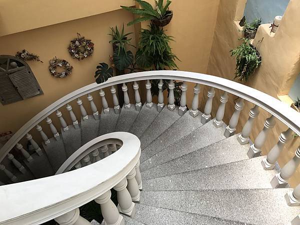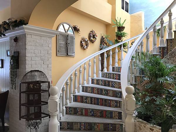 從一樓走旋轉樓梯至二樓,樓梯造型用馬賽克拼貼磁磚及搭配白色扶手,整體造型優美漂亮典雅,走到二樓設有許多座位,若要辦理多人聚餐或家族聚會活動時,可考慮選擇在這裡用餐