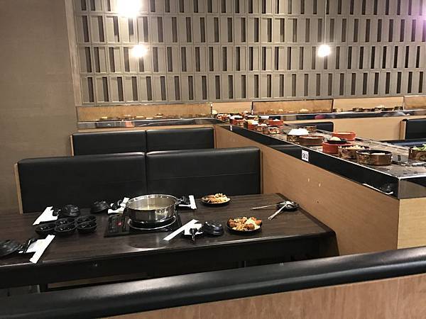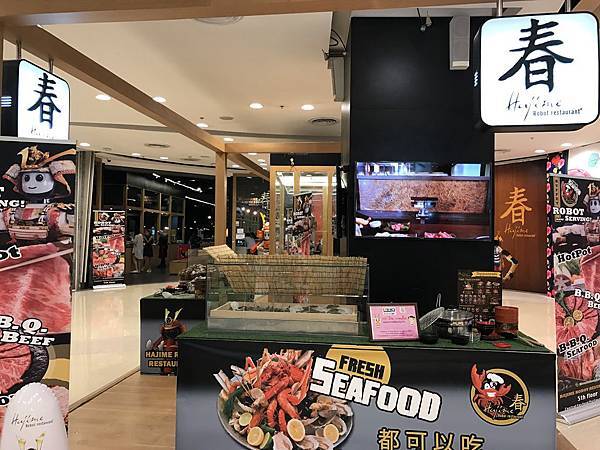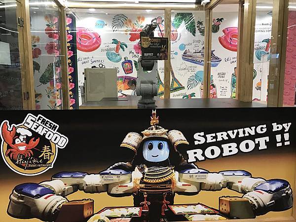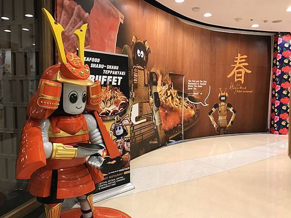 春機器人餐廳,位於芭達雅的Central Festival百貨公司,從百貨公司大型落地窗,看出去外面的風景就是美麗的海景,這家餐廳主打日式料理,為適合親子餐廳,餐點提供有吃到飽的Buffet涮涮鍋,以及由機器人當服務生送上餐的吃到飽日式BBQ,餐廳門口處就有展示由日本引進的機器人手臂,進入餐廳內就可以看到身穿日本武士盔甲機器人,若選擇日式BBQ吃到飽,在選擇好自己想要吃的餐點後,機器人就會親自幫您送上餐點,偶爾還不時看到武士機器人在跳舞娛樂大家,這次所選擇的是吃到飽的涮涮鍋,湯底選擇為壽喜燒口味,火鍋料特別放在輸送帶上感覺像廻轉壽司,刷刷鍋搭配著各種新鮮肉品海鮮及蔬菜別具風味